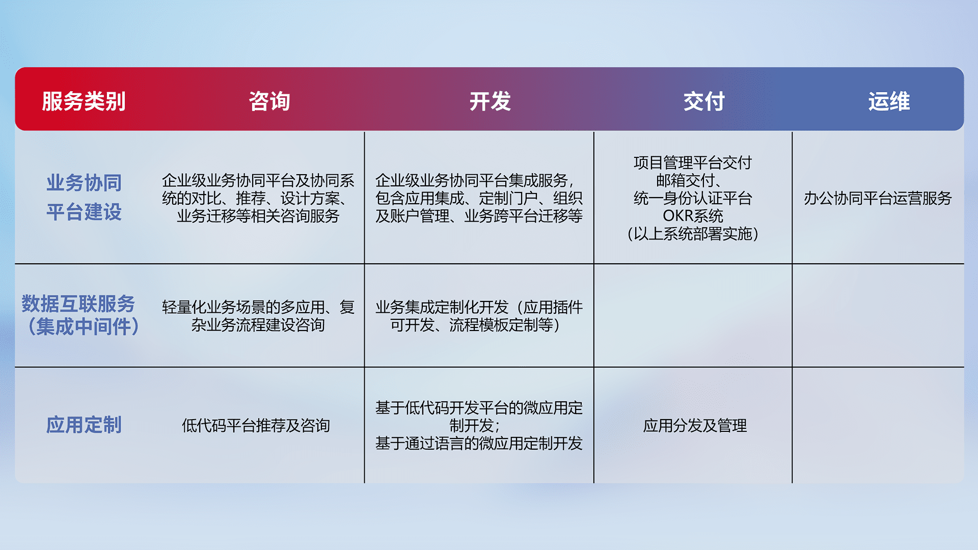 针对钉钉、、、、企微、、、、IDaas等平台级产品提供产品的规划、、方案、、交付、、、定制化开发等服务,,,实现如统一协同办公、、、智能客户服务、、、、混合会议管理、、、智能数据查询、、等业务场景,,实现数字化转型。。